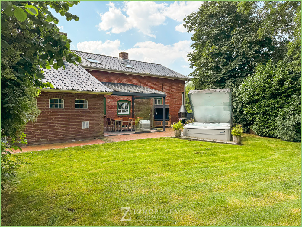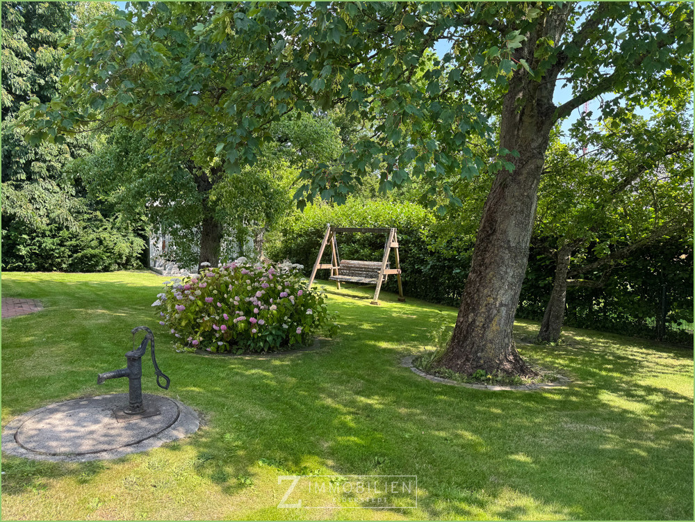 Das eingefriedete Grundstück mit altem Baumbestand ist ein echtes Highlight. Ein großes, elektrisches Einfahrtstor führt auf das großzügige Areal. Der gepflegte Garten ist nicht einsehbar.