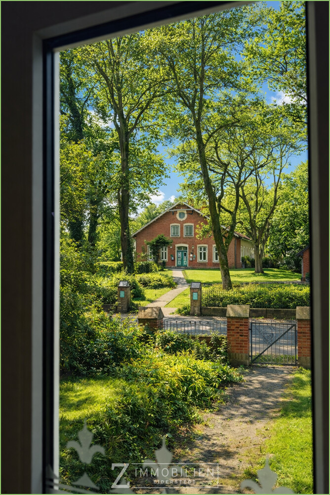 Der eingeschossige Backsteinbau mit Zwerchhaus, Veranda und Blick ins Grüne vereint historischen Flair mit Potenzial für neue Ideen und wartet darauf saniert zu werden.