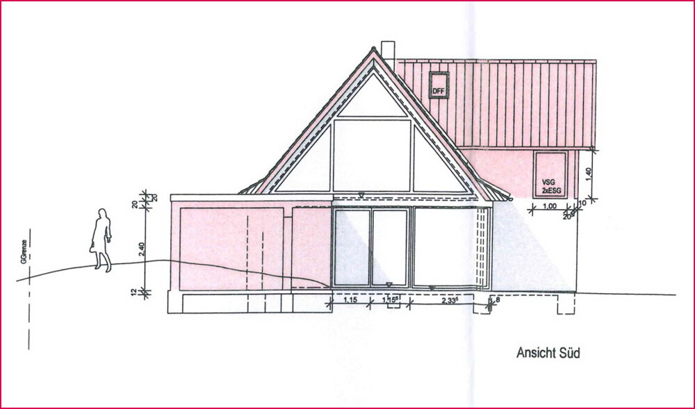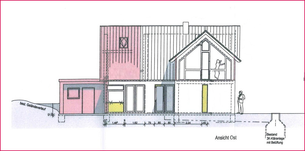 Geplant ist ein großzügiger, offener Wohn- und Essbereich mit offener Küche und bodentiefen Fenstern zur Terrasse, die den Blick in die Natur freigeben. Im Dachgeschoss sind drei Zimmer mit großen Giebelfenstern vorgesehen, auch wäre es möglich im Dachgeschoss ein weiteres Duschbad einzubauen. Ein separater Anbau für die Haustechnik sowie eine vorhandene vollbiologische Kläranlage runden das Konzept ab.