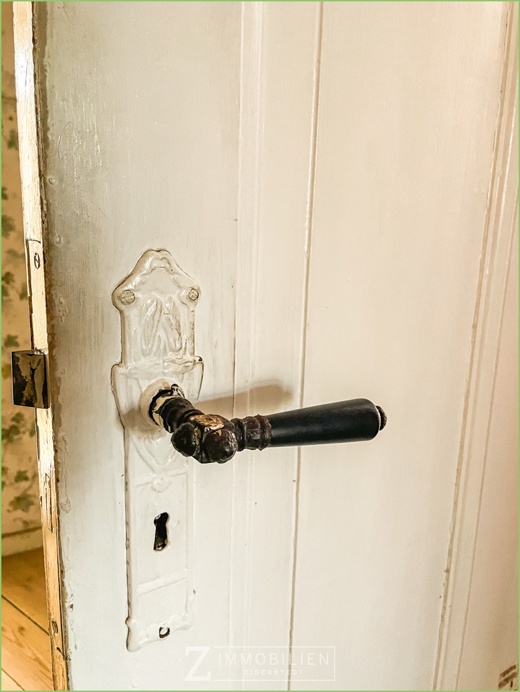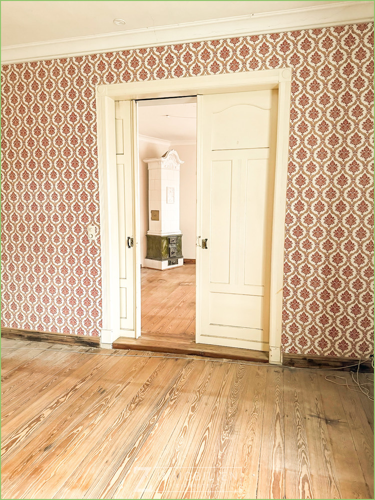 Ansicht Eingangsbereich große Diele Kachelofen Schiebetüren Küche mit Essbereich Historische Türklinken Flur im Dachgeschoss mit Geschichte Stallfenster im Anbau Ansicht