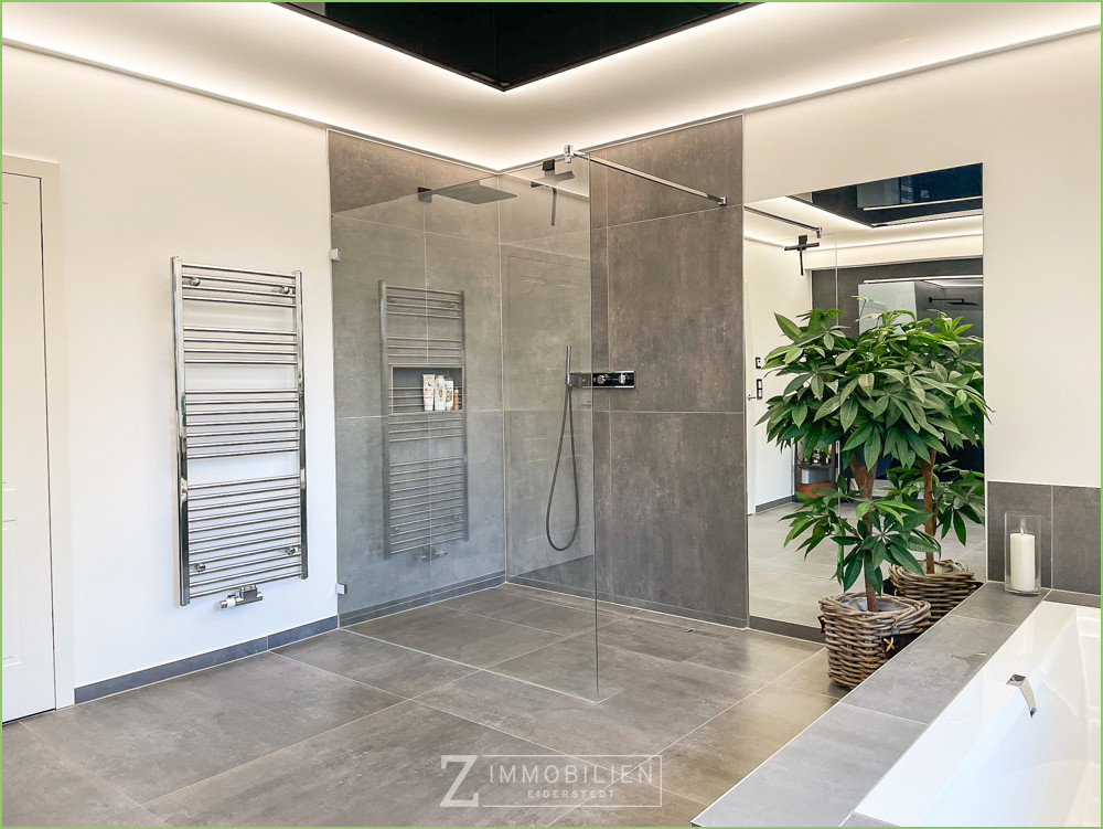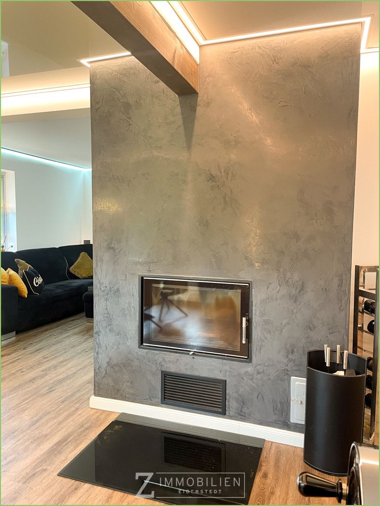 Die Wohnküche bildet das Herzstück des Hauses. Die Küche ist ein Traum für alle Kochfans und bietet neben den hochwertigen Geräten einen tollen Blick in den Garten und auf den Kamin. Dieser ist von zwei Seiten einsehbar und sorgt somit im ganzen Wohnbereich für ein gemütliches Ambiente. Ein weiteres Highlight ist das Badezimmer mit hochwertigen Armaturen und reichlich Platz. Neben einer Badewanne verfügt es über eine große Walk-In Dusche mit Regendusche.