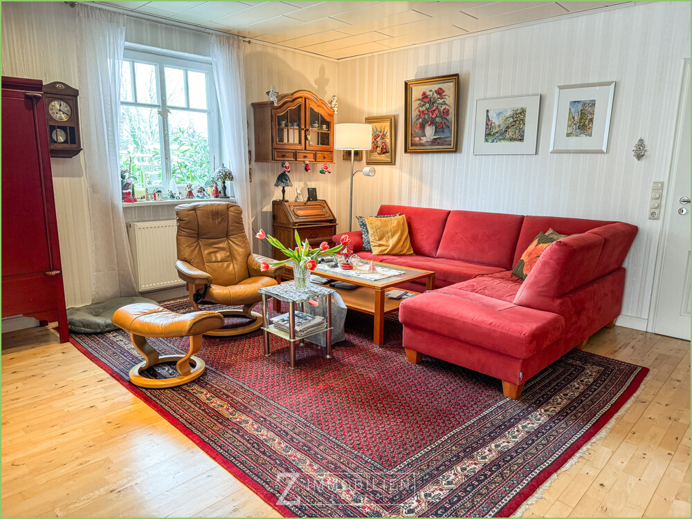 Im Erdgeschoss erwarten Sie eine helle Küche mit praktischem Nebenraum, ein großzügiger Wohn- und Essbereich mit Zugang zur überdachten Westterrasse sowie ein Gäste-WC. Der liebevoll angelegte Garten bietet entspannte Rückzugsmöglichkeiten.